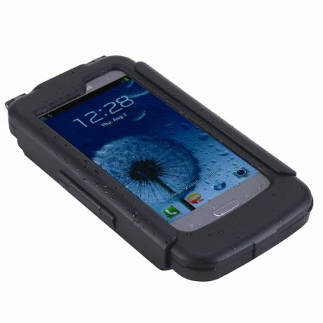 I use a bike mount waterproof case (like the one on the left) for my Samsung Galaxy SIII. I bought mine on ebay for $25, but similar ones are also available via Amazon. I attach this to the boat via 3M Dual Lock "Velcro". Other inexpensive waterproof cases are also available such as ones from iPEGA as well as the waterproof bag type cases. More expensive premium cases like the SEIDIO OBEX case are also available for the Galaxy S3, and I am sure there are similar solutions for other Android phones as well.