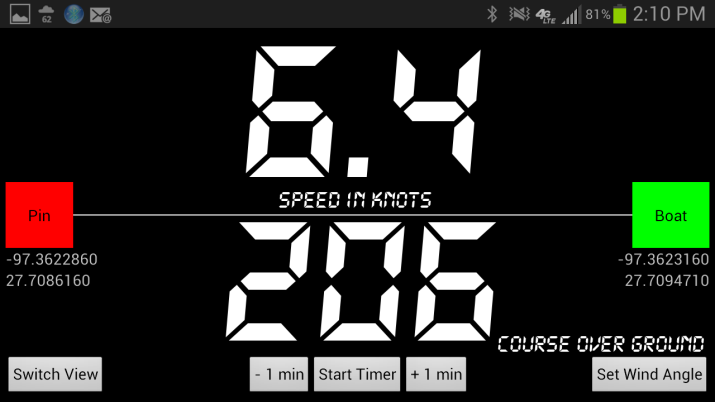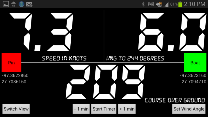 The racing view displays speed and velocity made good (VMG) to the wind side by side on the top and course over ground on the bottom. The racing view will also show only speed or only VMG on the top by "long pressing" either the current speed or current VMG readout respectively.