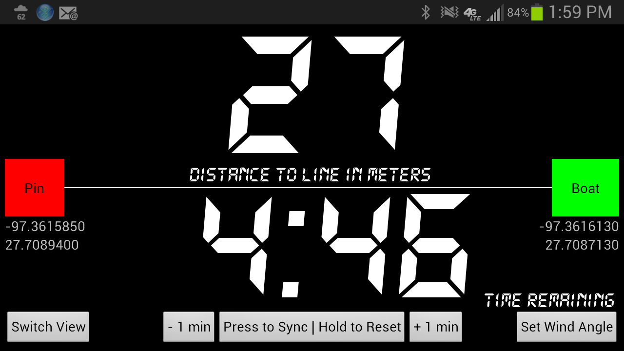 The starting view displays a distance to line calculation on the top and an adjustable timer on the bottom. When the timer completes, the view will be switched to the racing view. Switching between views manually can be done by pressing the "Switch View" button on the bottom left of the screen.